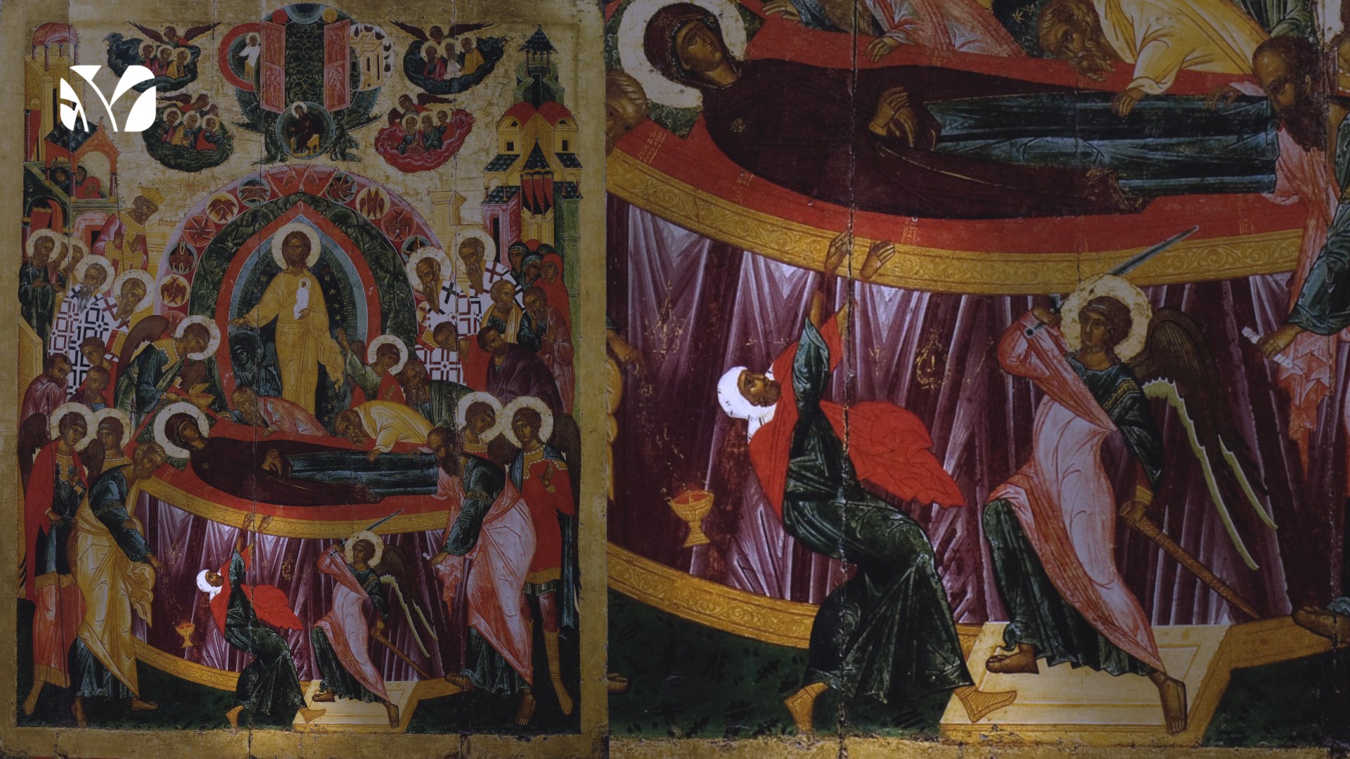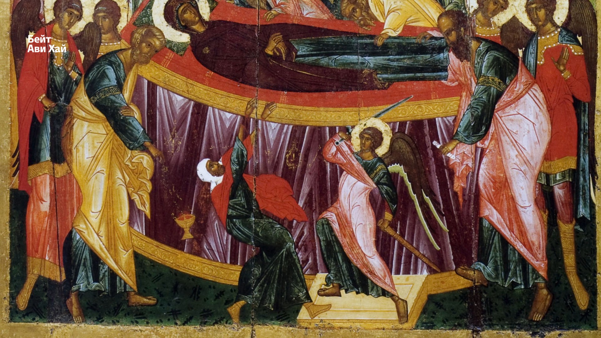Эта сцена отсылает к апокрифическому, как и весь сюжет Успения, рассказу о том, как еврейский первосвященник Иефания или Афония попытался опрокинуть одр Богоматери, но был остановлен божественным провидением. Этот эпизод был впервые описан еще в V-VI веках в апокрифе «Сказание об Успении Богородицы» Псевдо-Иоанна Богослова.