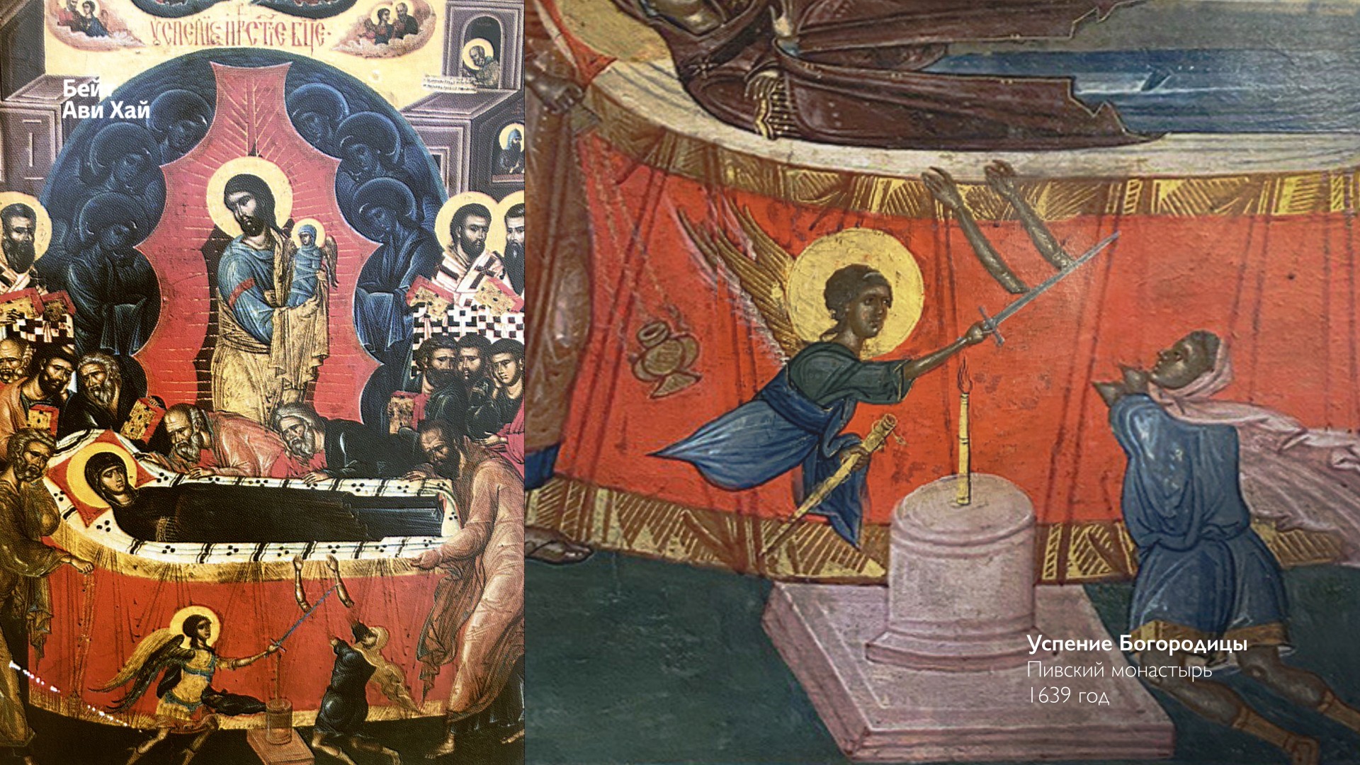 В православном искусстве евреев нередко обвиняли и в других грехах. К примеру, на русских и других православных иконах на сюжет об Успении Богородицы на переднем плане часто можно заметить некоего злодея — он пытается подкрасться к телу усопшей Божией Матери. Его ударом меча встречает ангел и отсекает обе кисти рук.