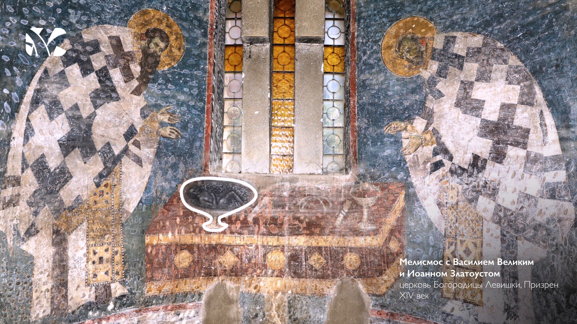 Эта иконография восходит к эпизоду жития св. Василия Великого, называемого «чудом о жидовине». Согласно преданию, некий еврей вошел в церковь, чтобы узнать о недоступных ему христианских таинствах, во время того, как Василий совершал службу. Еврей был очень удивлен, так как увидел в руках Василия младенца, которого тот разрубал на части.