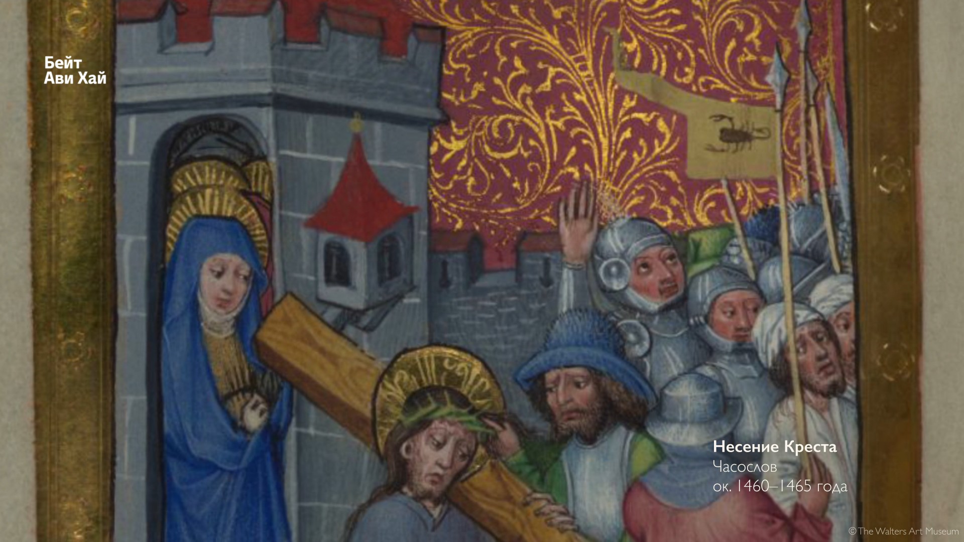 В сценах Страстей над иудейской стражей, которая конвоировала Христа на Голгофу, реяли желтые флаги с еврейскими или (псевдо)-еврейскими надписями, черным скорпионом или каким-то еще нехристианским и прямо дьявольским символом.