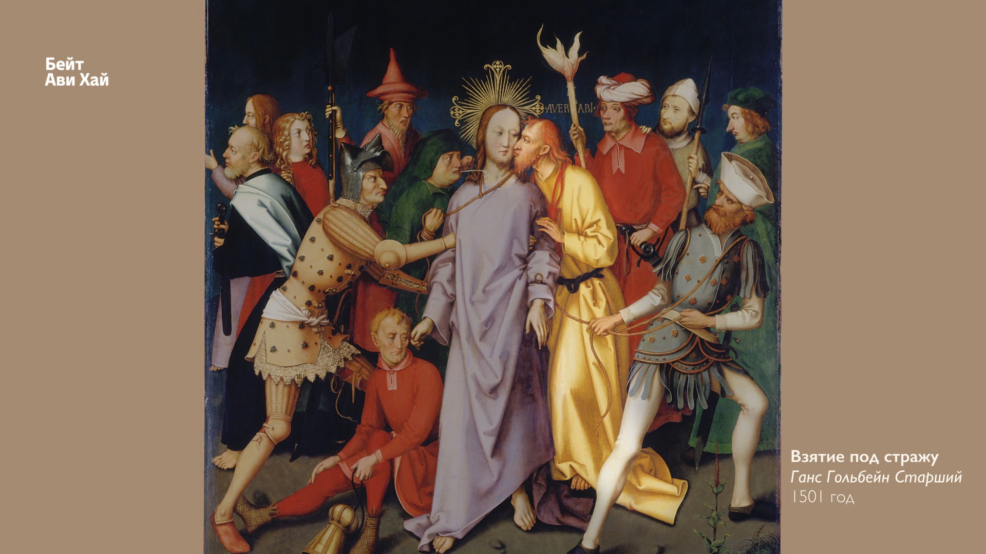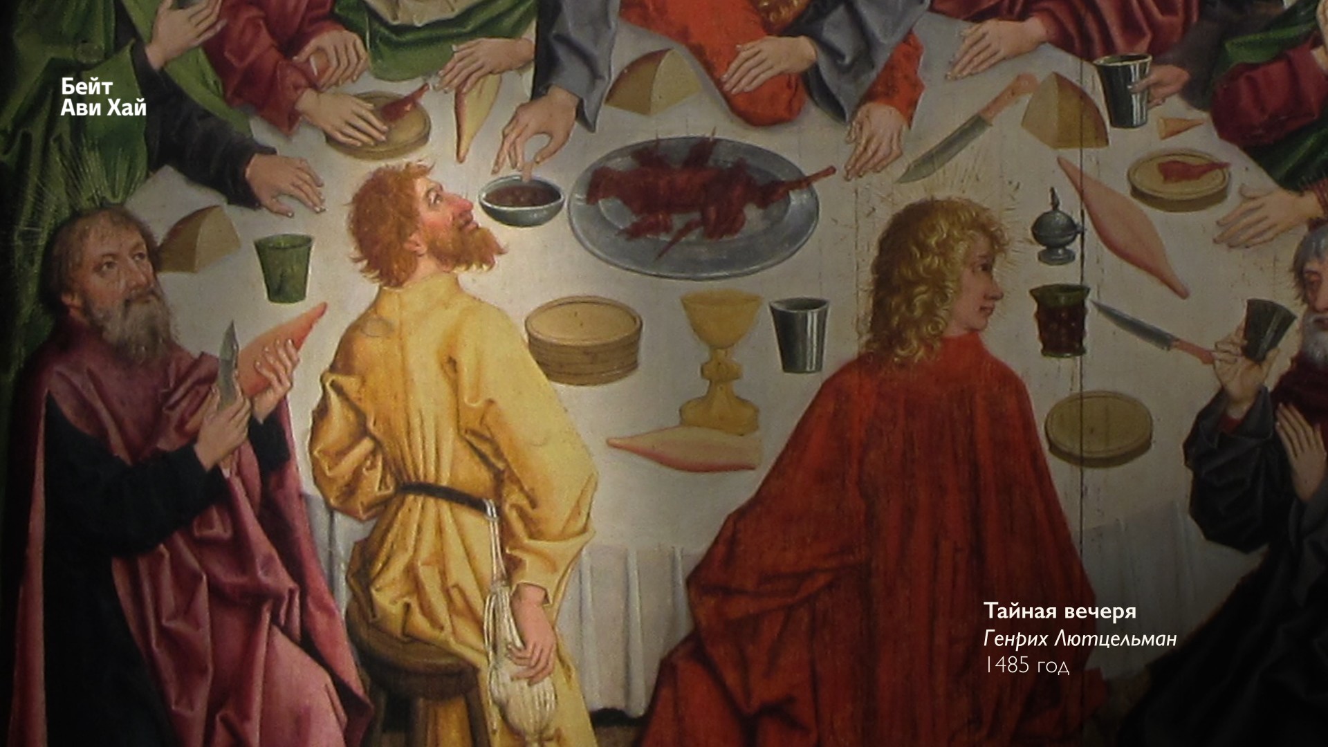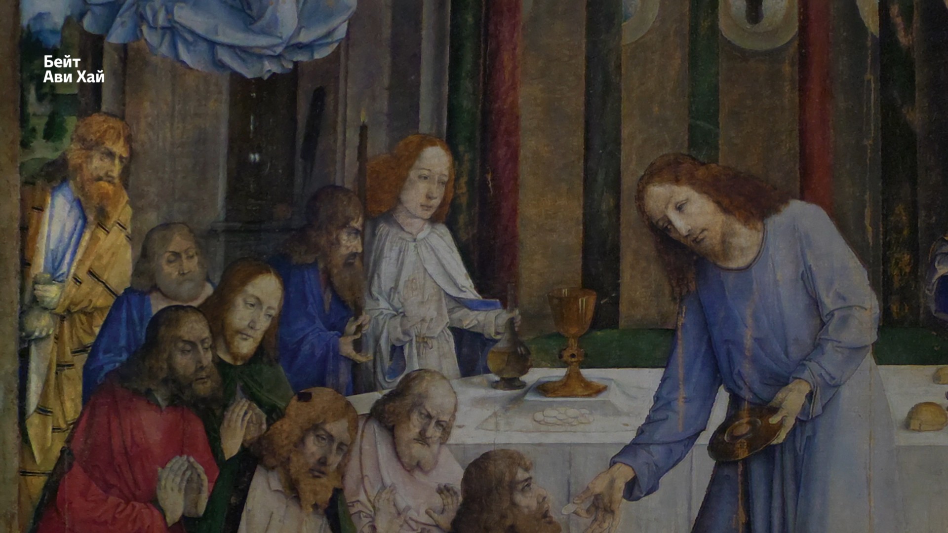 Он изобразил Христа, который на Тайной вечере причащает апостолов. У левого края панели, за спинами других учеников, стоит Иуда Искариот, который держит в руках мешочек с деньгами. На его плечи накинут плащ, похожий на талит — еврейское молитвенное покрывало. Он выкрашен в желтый.