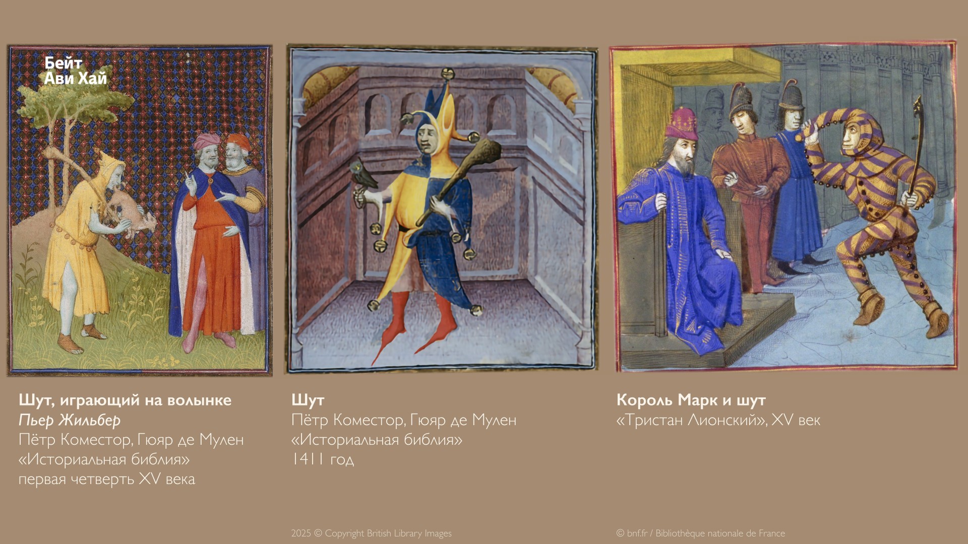 Если судить по сохранившимся изображениям шутов, их костюм (с длинными ушами и бубенцами) часто красили в желтый цвет, делали двуцветным (желто-зеленым или желто-красным) или полосатым с преобладанием желтого.